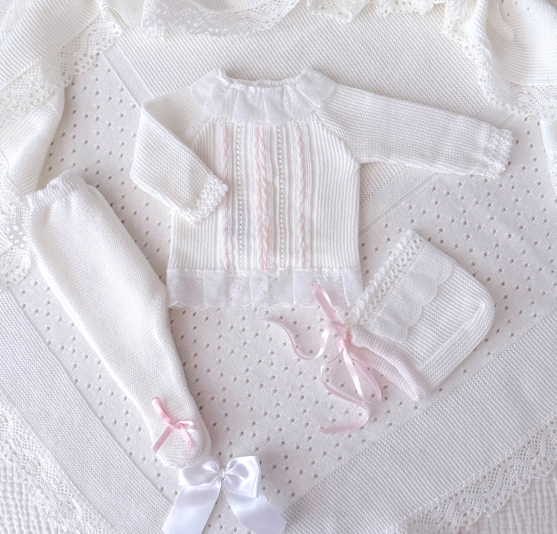 Our darling knitted Eliana outfit includes beautiful knitted bottoms a long sleeve top and delightful bonnet. This set was made in Spain and features the finest knitted and lace detailing. Handy buttons to the back so you can easily take on and off. Stunning pastel pink and pure white coloring perfect for a newborn baby. Simply divine!