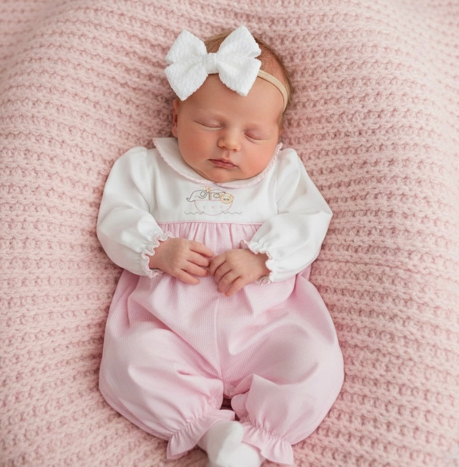 This Noah's Ark embroidered longall is a perfectly sweet outfit for a perfectly sweet little girl. Our embroidered bubble comes in a soft pastel pink check fabric with Noah's Ark themed embroidery on the front. This peter pan collar long sleeve romper is made with a cotton-poly blend fabric that is lightweight, airy and machine washable for easy care!
