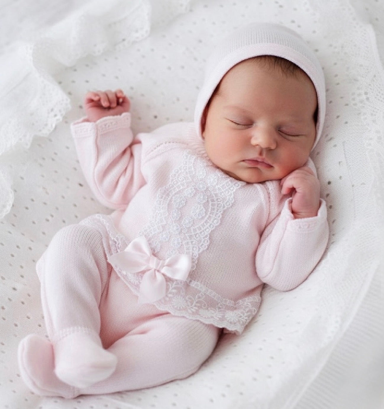 Adorable baby two-piece outfit knitted in a supersoft pastel pink yarn. With an elaborate lace panel down the front and around the hem and a lovely ribbon bow. The matching trousers have an ultra comfort elasticated waist and cosy enclosed feet. Comes with a cute little bonnet.