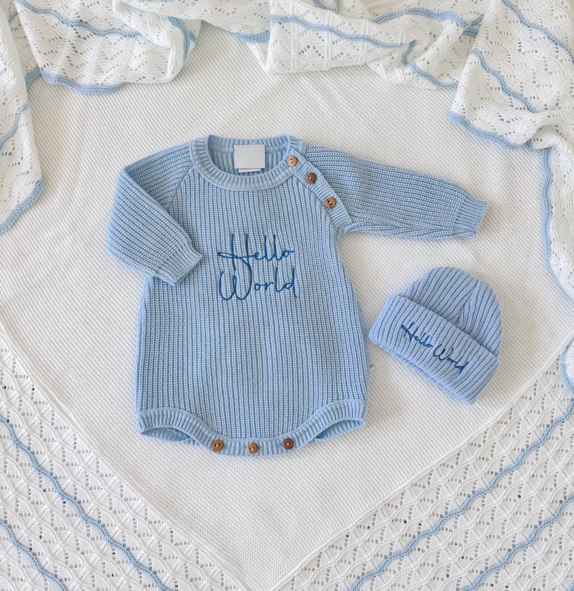 Welcome your little one in style with our cozy “Hello World” knit romper set. Crafted from soft, breathable yarn, this charming pale blue ensemble features a long-sleeve romper with delicate bright blue embroidery and wooden button details at the shoulder and crotch for easy changes. The matching knit hat completes the look, making it a perfect choice for birth announcements, coming home outfits, or a thoughtful newborn gift. Both timeless and practical, this set wraps your baby in warmth and sweetness from their very first moments. Made in Portugal.