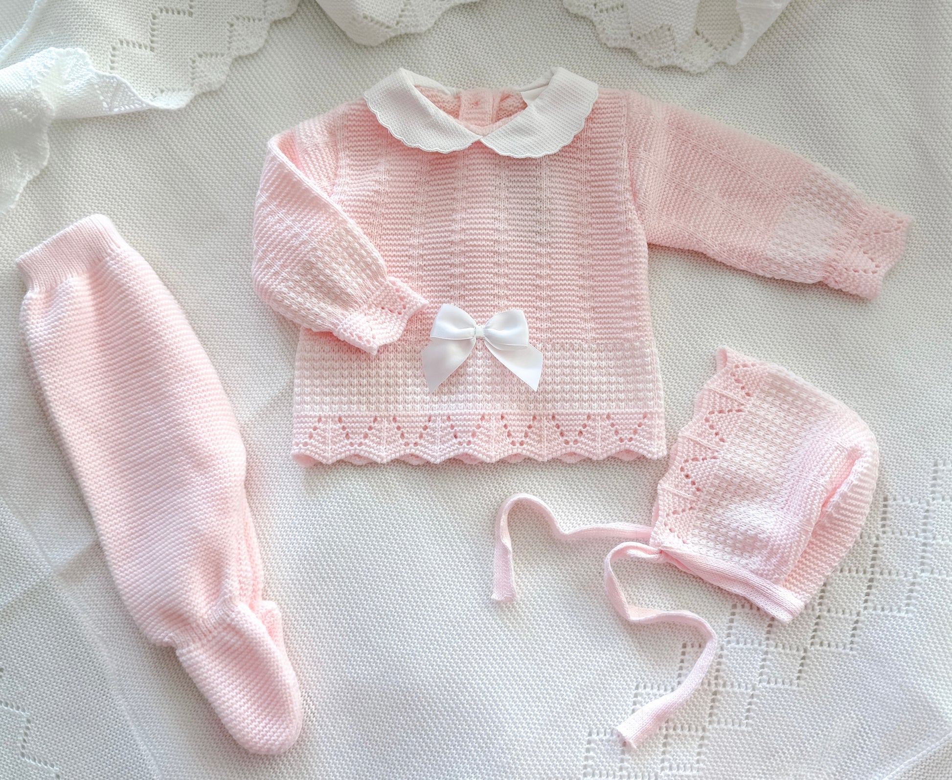 A beautifully soft knitted baby set featuring a delicate pastel design with matching bonnet and footed bottoms. Crafted in acrylic knit for lightweight warmth and easy care, it’s gentle on delicate skin while keeping baby cozy. Made in Portugal, this timeless set is perfect for everyday comfort or special occasions.