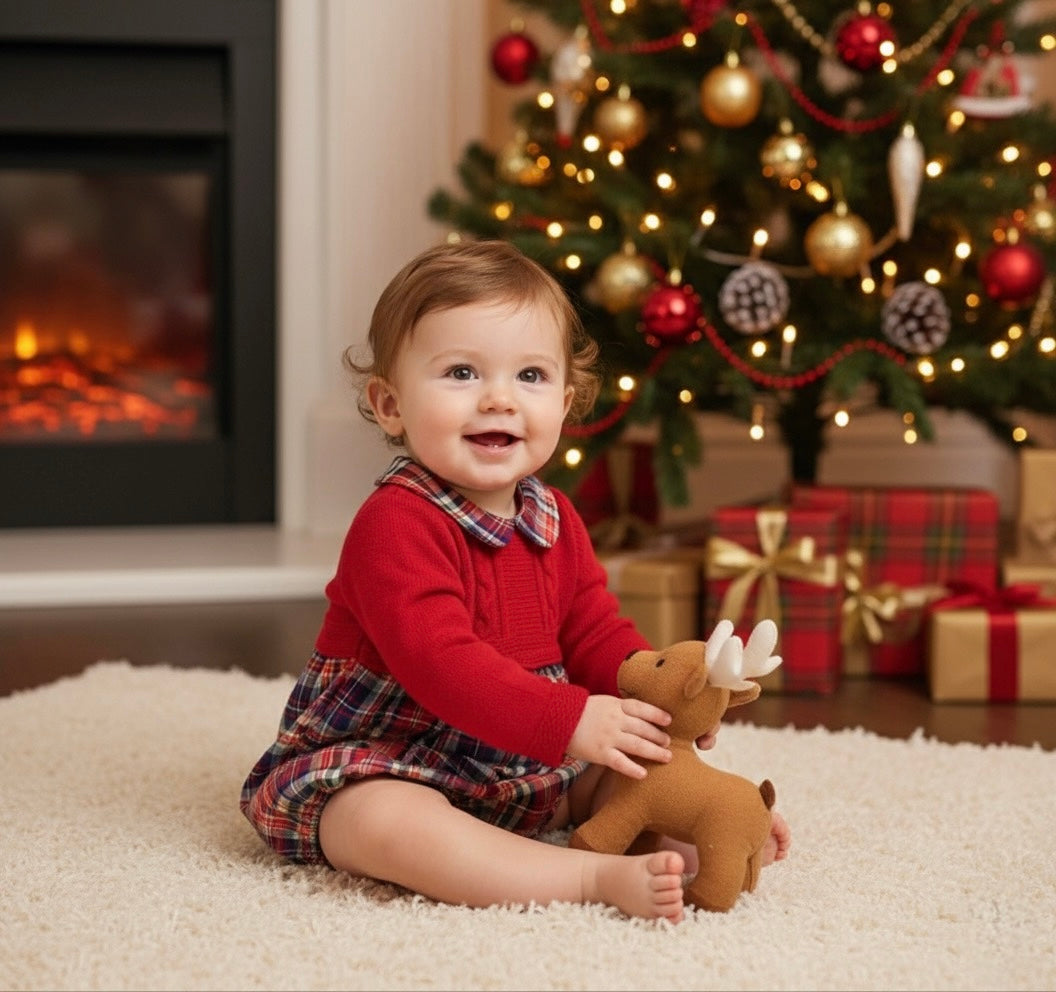 Adorable tartan fabric and knitted mix romper suit. The top has been gently knitted in a wonderfully supersoft rich red yarn and has convenient buttons to the back. The bottom and collar are both in a softly brushed tartan fabric. Perfect festive outfit.