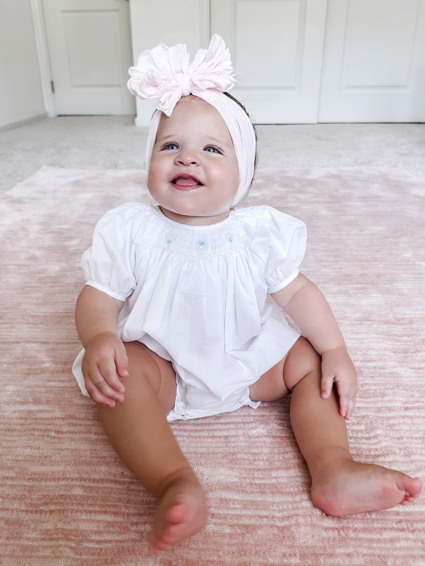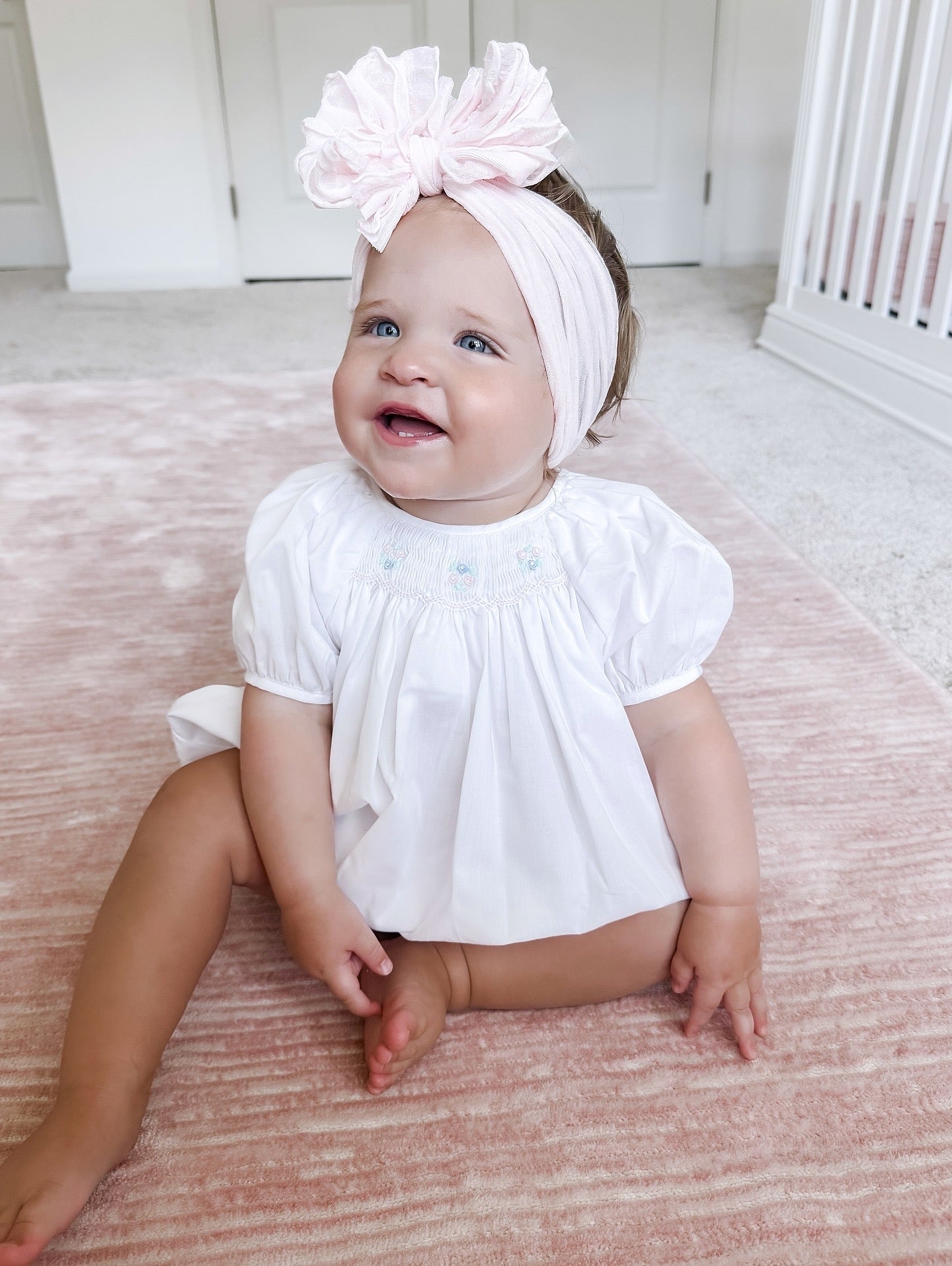 Our soft and delicate newborn bubble for baby girls makes a beautiful outfit for family photos or special occasions. Featuring hand smocking and hand embroidered flowers with dainty seed pearls. The lightweight batiste fabric keeps little ones cool and comfortable and is easy to care for – just machine wash and tumble dry. A simply gorgeous bubble that is sure to become a treasured keepsake. Matching hat is included.