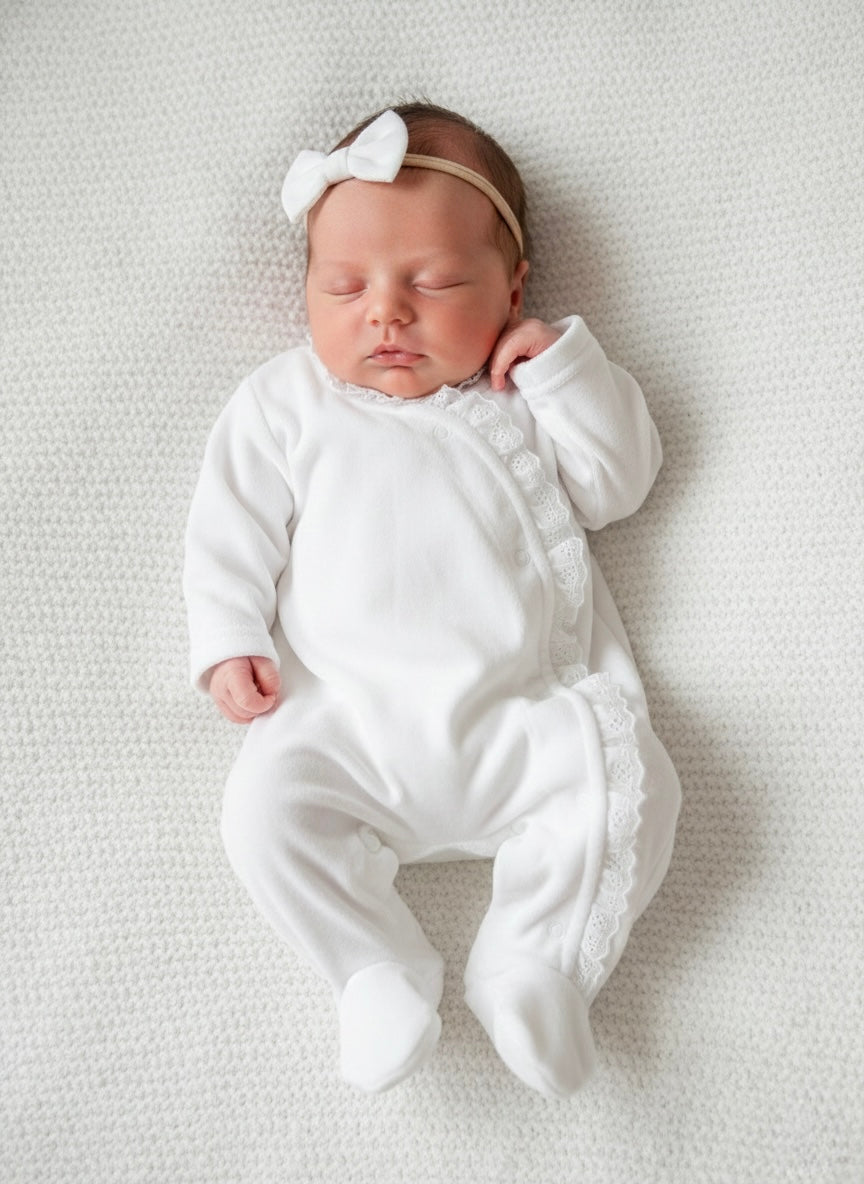 An adorable new addition to our sleepsuit collection. Made in the softest cotton velour and featuring a lovely broderie lace trimmed neckline. Premium velour.